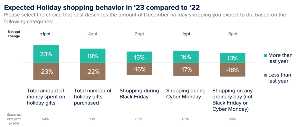 The total amount consumers say they plan to spend is up one percentage point from 2022 levels, while the total number of items they expect to purchase is down four percentage points from last year.