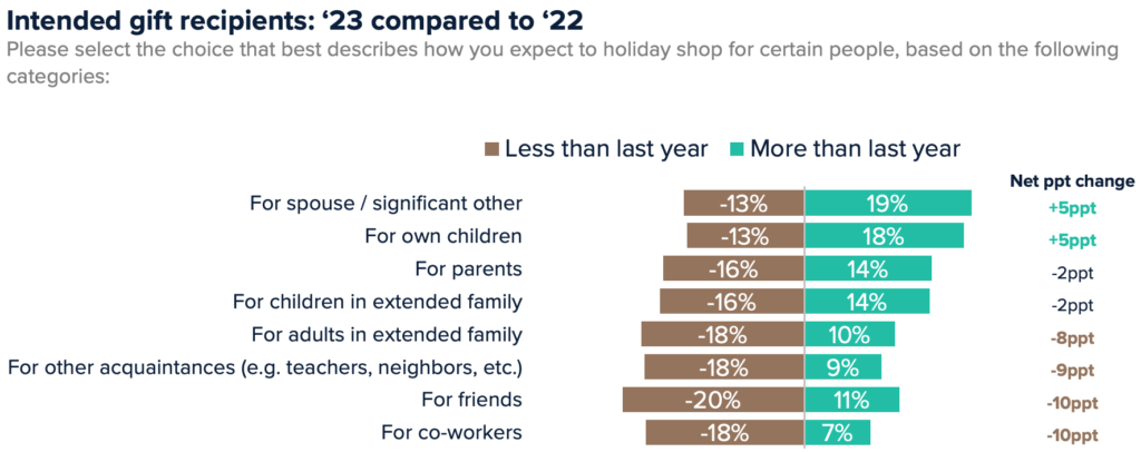 As the effects of inflation on consumer behavior persist, we expect holiday shopping budgets to be tighter this year for many consumers. That said, shoppers will likely also spend about as much as they did last year — and that spending will be high in certain categories, like clothing and electronics. But don’t be surprised if extended family members and acquaintances get cut from the shopping list this year, as consumers double down on getting more for their closest loved ones.