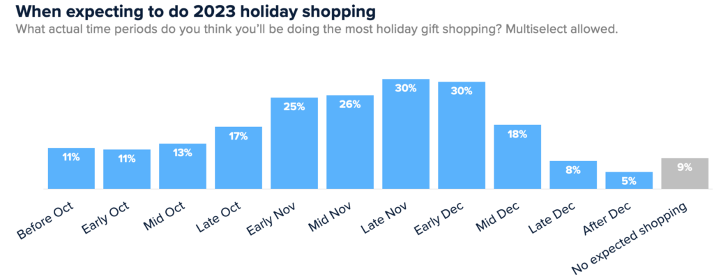 While some early shoppers say they will get started before October, the bulk of shopping is likely to take place between early November and early December, according to our insights.