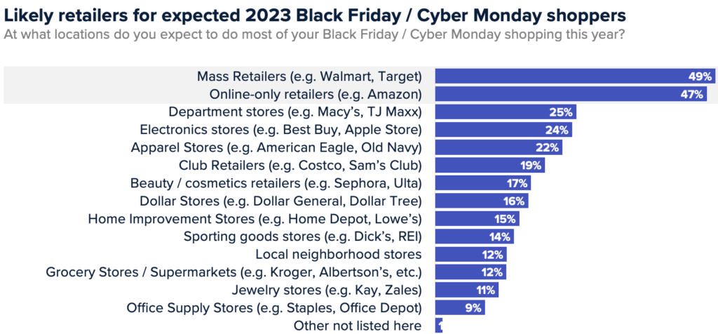 Nearly half of consumers say they plan to purchase from brands like Walmart and Target (49%) and a similar share (47%) plan to do their shopping with ecommerce brands like Amazon.