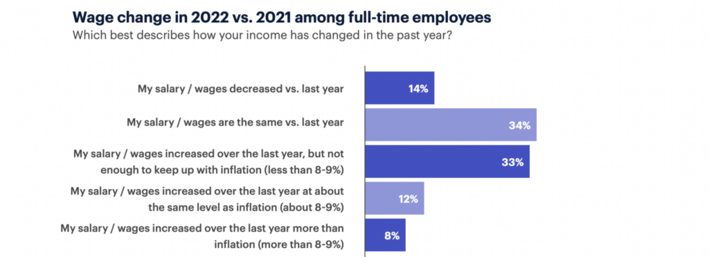 Consumers overwhelmingly feel that compensation hasn’t kept up with inflation. In the report, most consumers say their wages are unchanged compared to 2021. Others, meanwhile, say they received an increase in compensation but the boost in pay isn’t enough to outpace inflation.