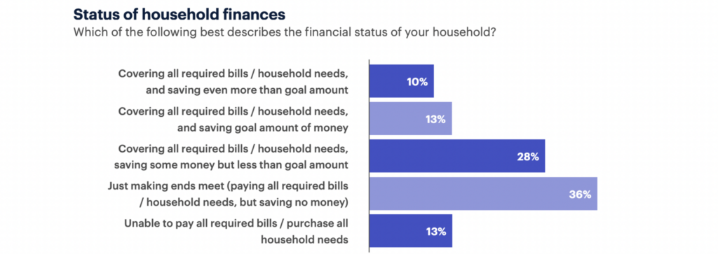 As of this writing, inflation currently sits at 10.9%. With prices climbing faster than we’ve seen in decades, less than 10% of consumers say their salary / wages increased more than the rate of inflation over the last year (that is, by more than 8-9%), and, at the same time, only 23% of consumers say they’re able to cover all of their bills and meet or exceed their goal savings amount.