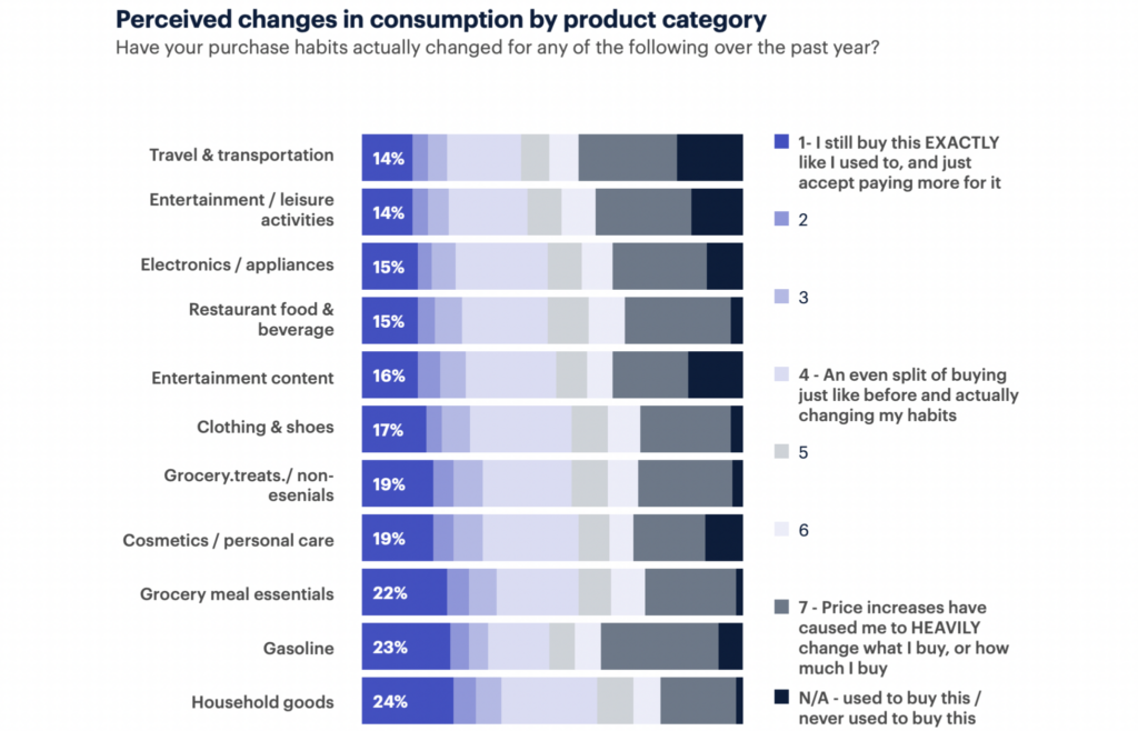 3. Consumers have made the biggest spending changes within “nice to have” product categories, including travel and entertainment. Conversely, they have made the least changes to their spending habits within more essential product categories, including household goods and gasoline.