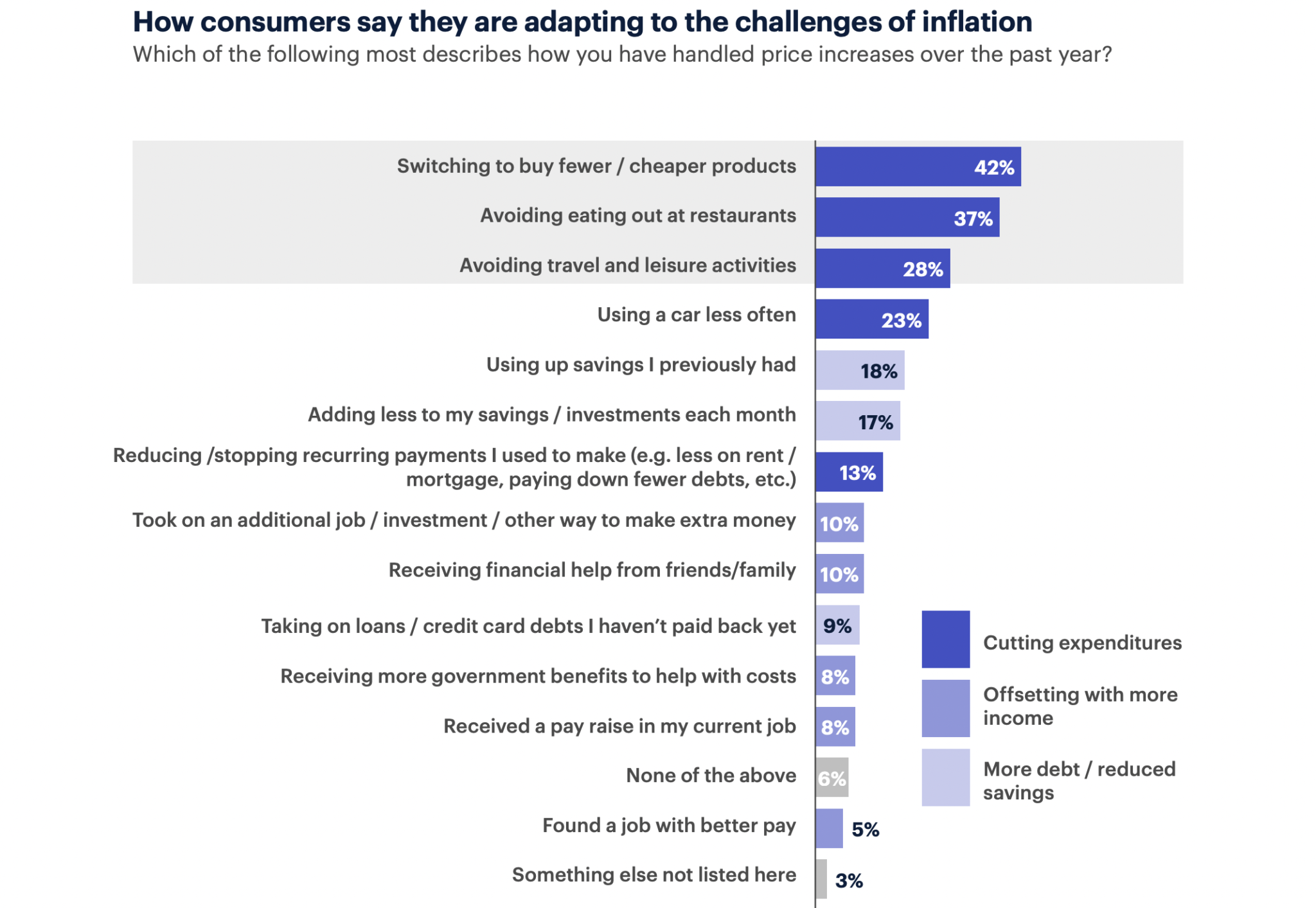 2. Nearly half of consumers (42%) say they’re handling price increases by switching to buying fewer / cheaper products. A smaller number have turned to finding additional sources of income or are turning to reduced savings / more debt to adjust to inflation.