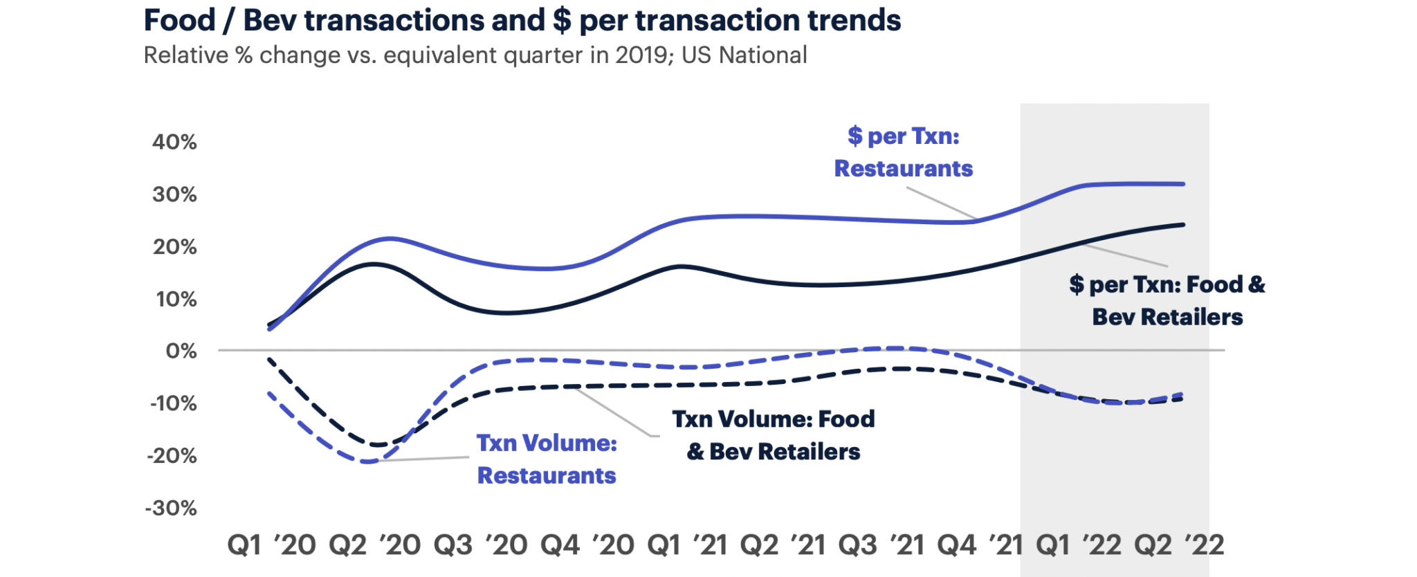4. Consumer transactions at restaurants and grocery stores have slowed down in the first half of 2022, after being up by the end of 2021 compared with spring 2020 levels. Because prices have increased, however, overall spend per transaction is up.