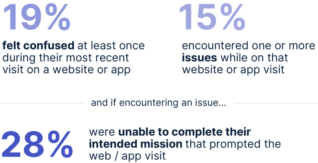 About 1 in 5 consumers tell us they felt confused at least once during their most recent website or app user experience, and 15% say they encountered one or more issues while on that website or app visit. For those that encountered issues, more than 1 in 4 (28%) report being unable to complete their customer journeys.