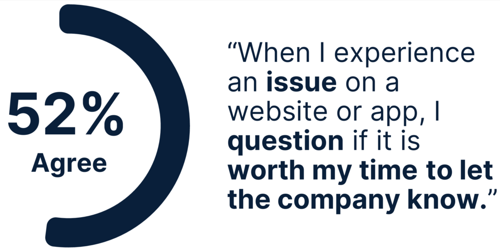 Not only that, consumers tell us that they’re 22% less likely to leave feedback about their experience if they have an issue that’s unresolved versus when they have an issue that eventually gets resolved, meaning the voices of customers potentially encountering the biggest challenges aren’t as likely to be heard. Fifty-two percent wonder if it’s worth letting the company know about the issue.