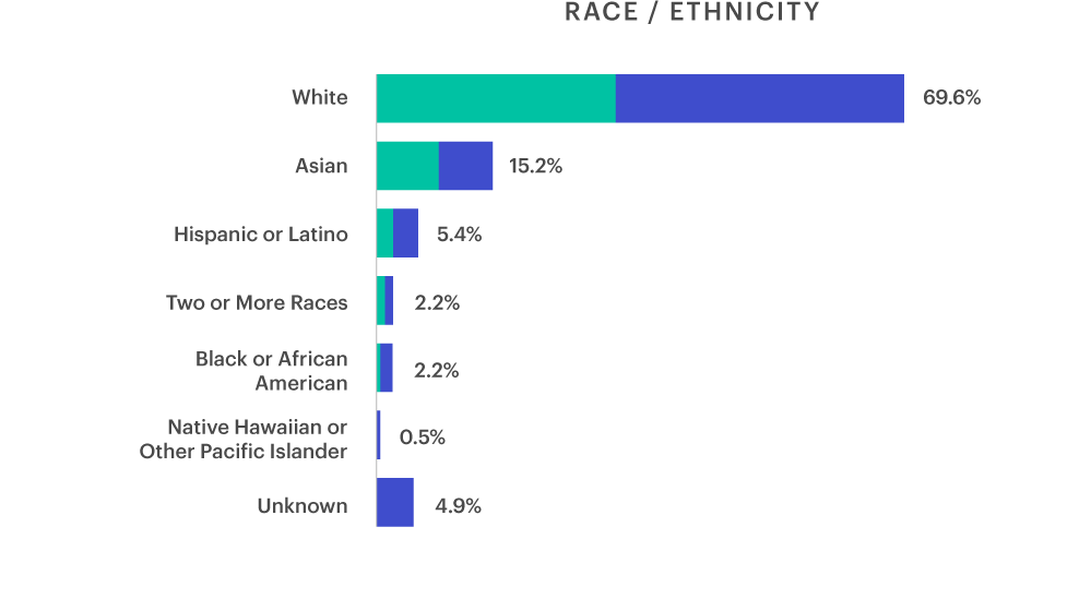 Data as of 5/31/2025. Gender data is global. Race/Ethnicity data is US only. All data is self-reported. Leadership is Director level and above with direct reports. Numbers may not add up to 100% due to rounding.